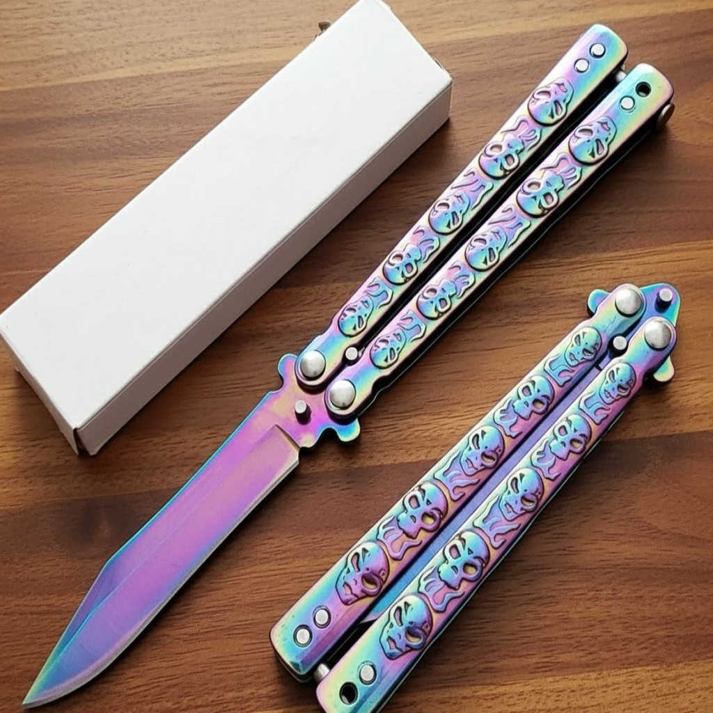 Bu kelebek çakı, sadece görünümüyle değil, dengeli yapısıyla da dikkat çeker. Kuru kafa figürleriyle zenginleştirilmiş kabza yapısı, çevirme (flipping) hareketleri sırasında mükemmel bir tutuş ve denge sağlar. 22 cm'lik toplam uzunluğu ve güvenli kilit mekanizması sayesinde hem profesyonel antrenmanlarda hem de doğa aktivitelerinde güvenle kullanılabilir.