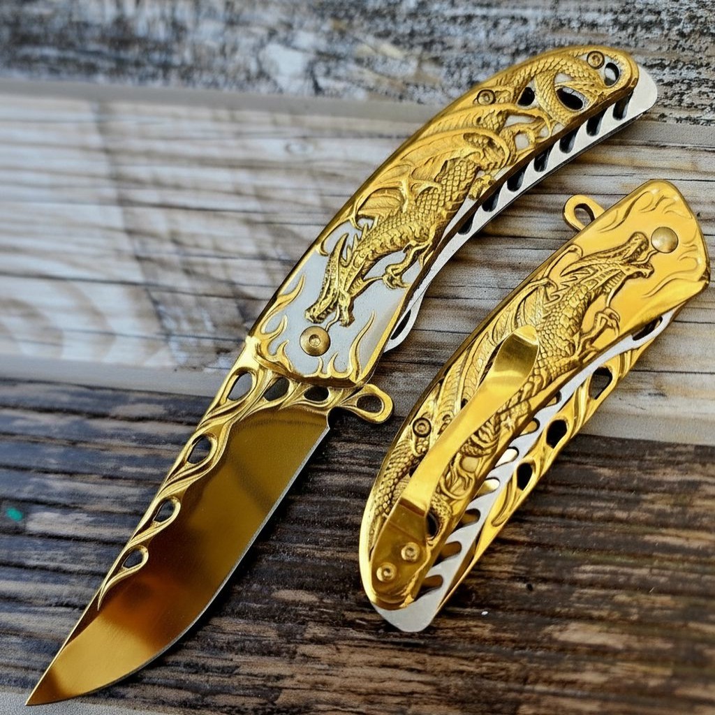Bu özel modelin en dikkat çekici özelliği, üzerinde titizlikle işlenmiş Ejderha deseni ve göz kamaştırıcı Gold (Altın) rengidir. Sap kısmında kullanılan Titanyum Nitrür (TiN) Kaplama, ürüne sadece lüks bir görünüm kazandırmakla kalmaz, aynı zamanda aşınmalara ve çizilmelere karşı ekstra bir zırh görevi görür. Kompakt yapısı ve kemer klipsi sayesinde doğa yürüyüşlerinde, kampta veya günlük kullanımda her an yanınızda.