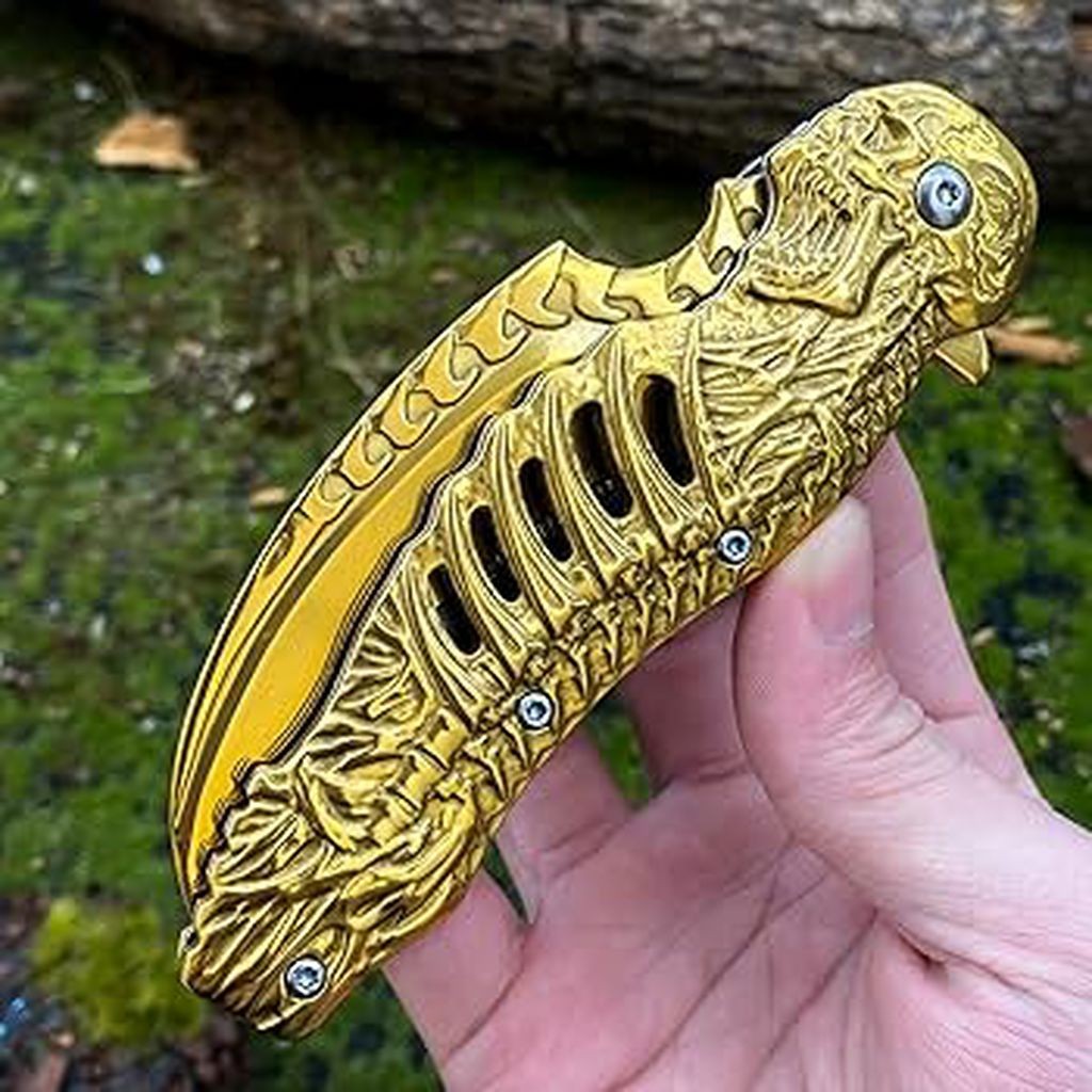 Browning Gold İskelet Tasarımlı Karambit Çakı, hem estetik tasarımı hem de üstün malzeme kalitesiyle outdoor dünyasında fark yaratıyor. Altın sarısı (Gold) rengi ve kabzasındaki özel kurukafa iskelet figürleri, bu bıçağı sadece bir araç değil, aynı zamanda etkileyici bir koleksiyon parçası haline getiriyor.