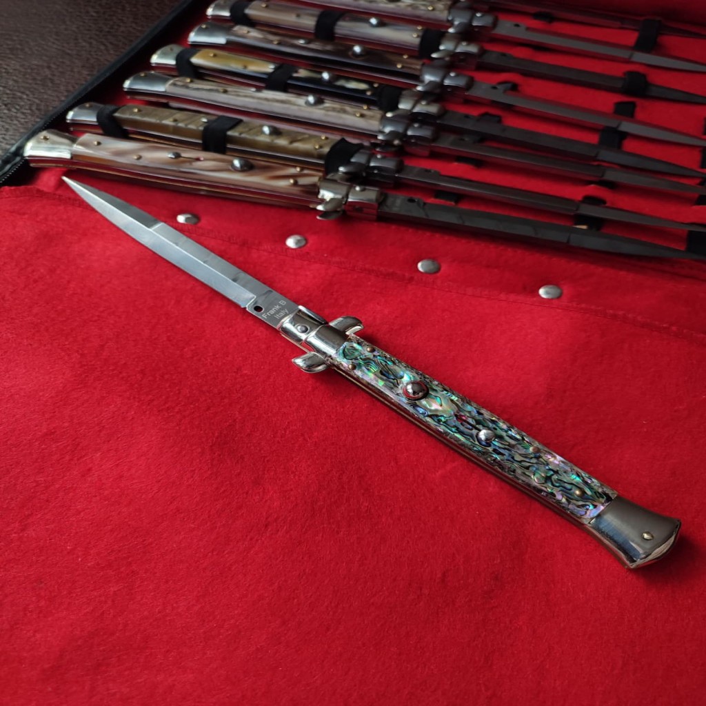 Bu eşsiz stiletto, namlusunda kullanılan İsveç Çeliği Damascus sayesinde sadece üstün bir keskinlik sunmakla kalmaz, aynı zamanda göz alıcı hareleriyle görsel bir şölen sunar. 28 cm’lik toplam uzunluğu ve estetik Bayonet ağız yapısı, geleneksel İtalyan çizgilerini korurken; kabzasında kullanılan Deniz Kulağı (Abalone) kaplaması, ışığın açısına göre değişen mavi ve çok renkli yansımalarıyla bıçağa mücevher değeri katmaktadır.