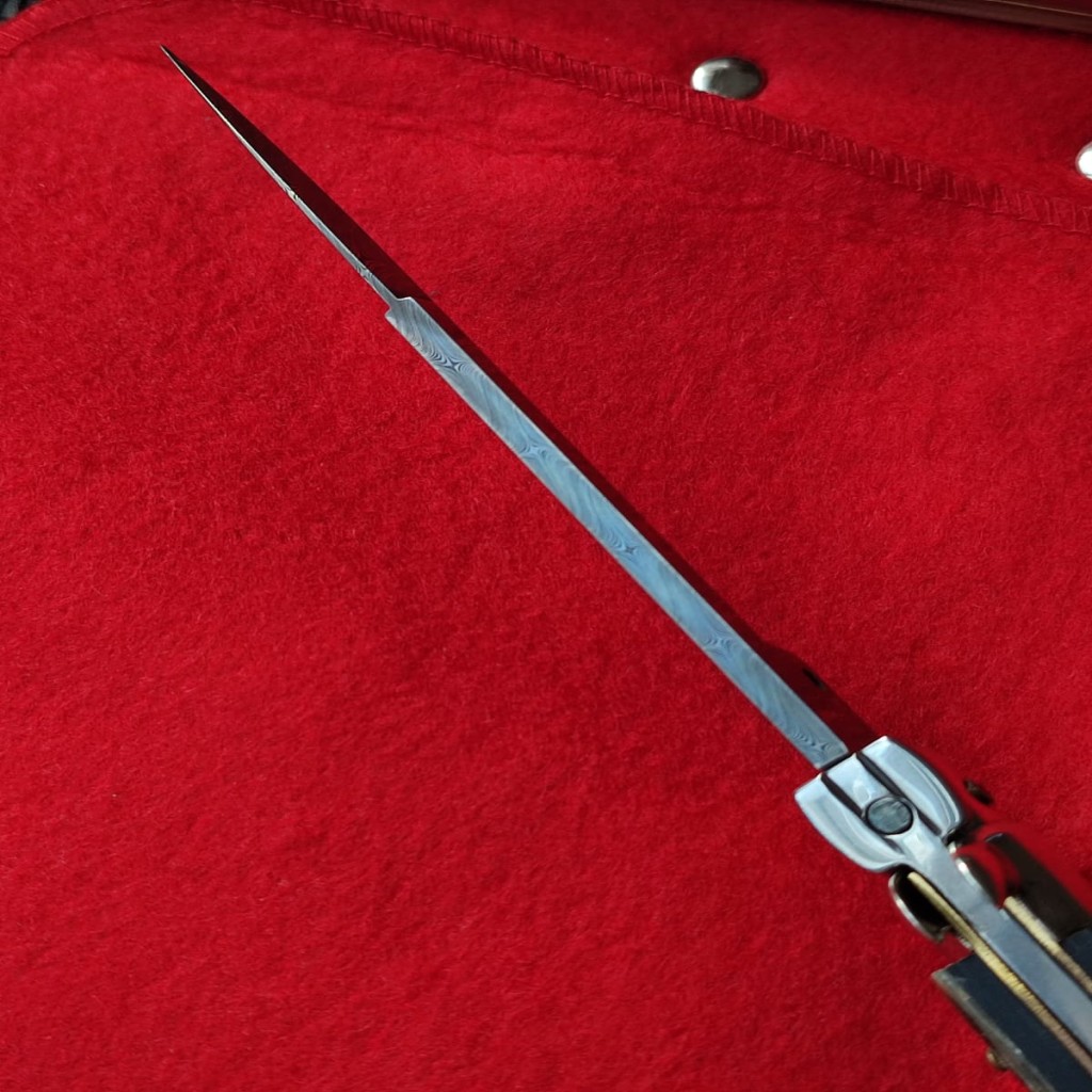 Koleksiyoncuların ve bıçak sanatına tutkuyla bağlı olanların gözdesi Frank Beltrame Limited Edition 28 Cm Paslanmaz İsveç Damascus İtalyan Stiletto, zarafet ve mühendisliğin zirvesini temsil ediyor. İtalyan bıçak işçiliğinin dünyaca ünlü ismi Frank Beltrame imzası taşıyan bu özel üretim model, nadir bulunan materyallerle modernize edilmiş klasik bir sanat eseridir.
